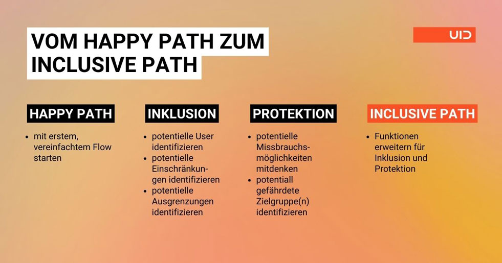 In der Produktentwicklung orientieren wir uns zum Einstieg häufig am optimalen User. Wird dieser sogenannte „Happy Path“ aber aufgrund von Zeitdruck oder Budget nicht weiterentwickelt, schließt das Produkt viele Nutzungsgruppen aus, da sich dieser Ansatz ausschließlich an der idealen Zielgruppe orientiert.